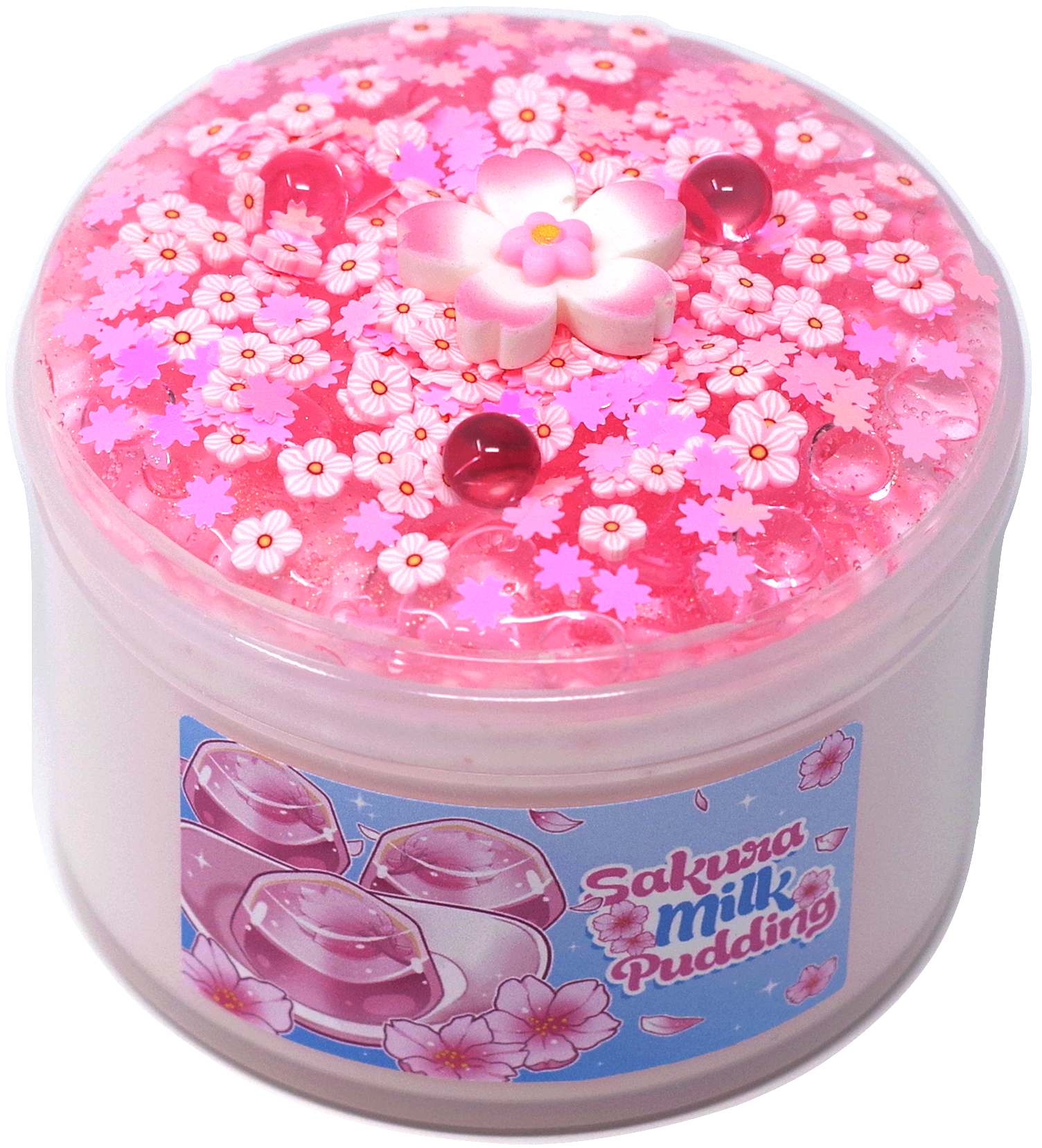 Sakura Milk Pudding is one of the prettiest slimes we’ve ever made! It features a thick base which meshes perfectly with the floam beads and comes with this gorgeouuusss pink glittery topper with fishbowl beads as well as adorable sakura themed add ins. The base is ultra thick and different from Kinoko Krunch + Cabbage Patch as they use different glue blends and ratios. As you can hear in the video this slime makes absolutely fantastic and LOUD bubble pops 🤩