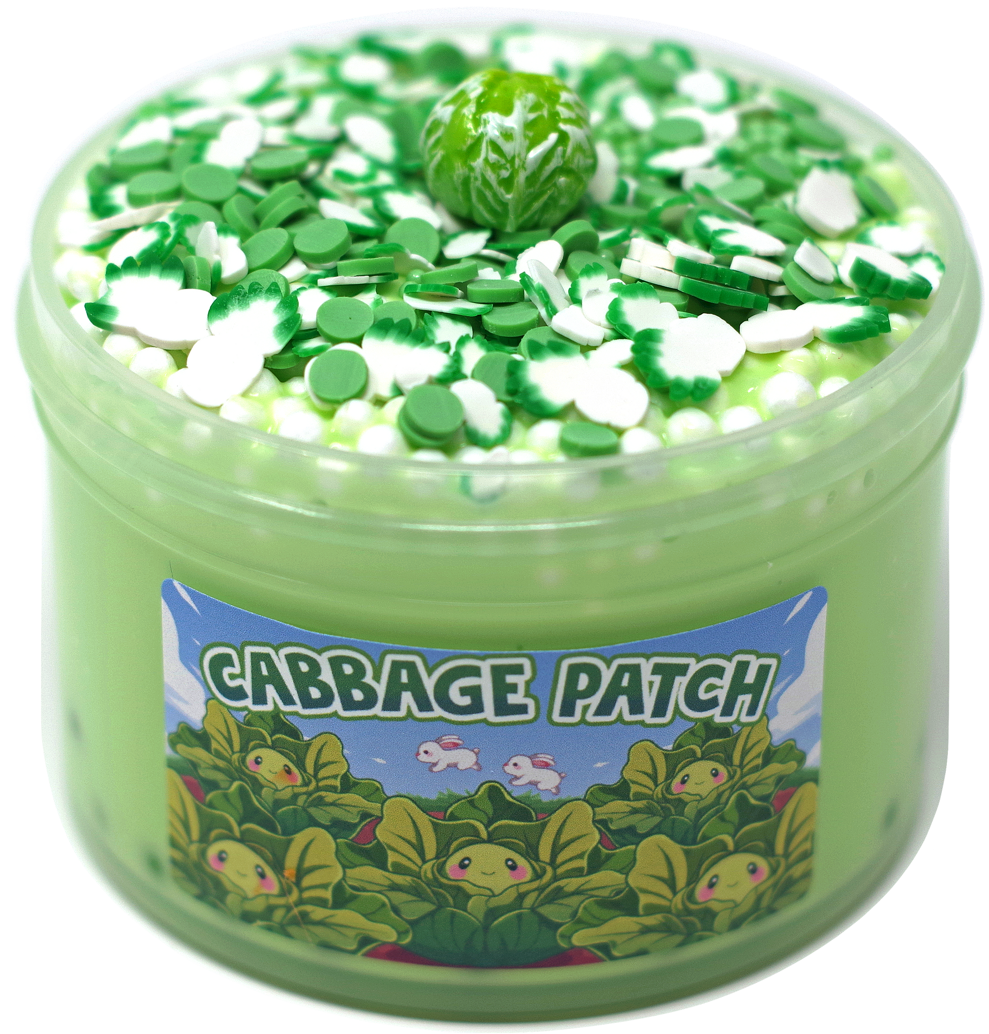 Cabbage Patch is a floam slime with some bubble beads incorporated in the base. This slime is a treat for your eyes and hands, with a fun aesthetic that’s almost too cute to play with (almost). It produces satisfying pops and stretches and has a unique hand-feel! The combined beads create a texture that traps lots of air, making the slime puffy and inflatable.